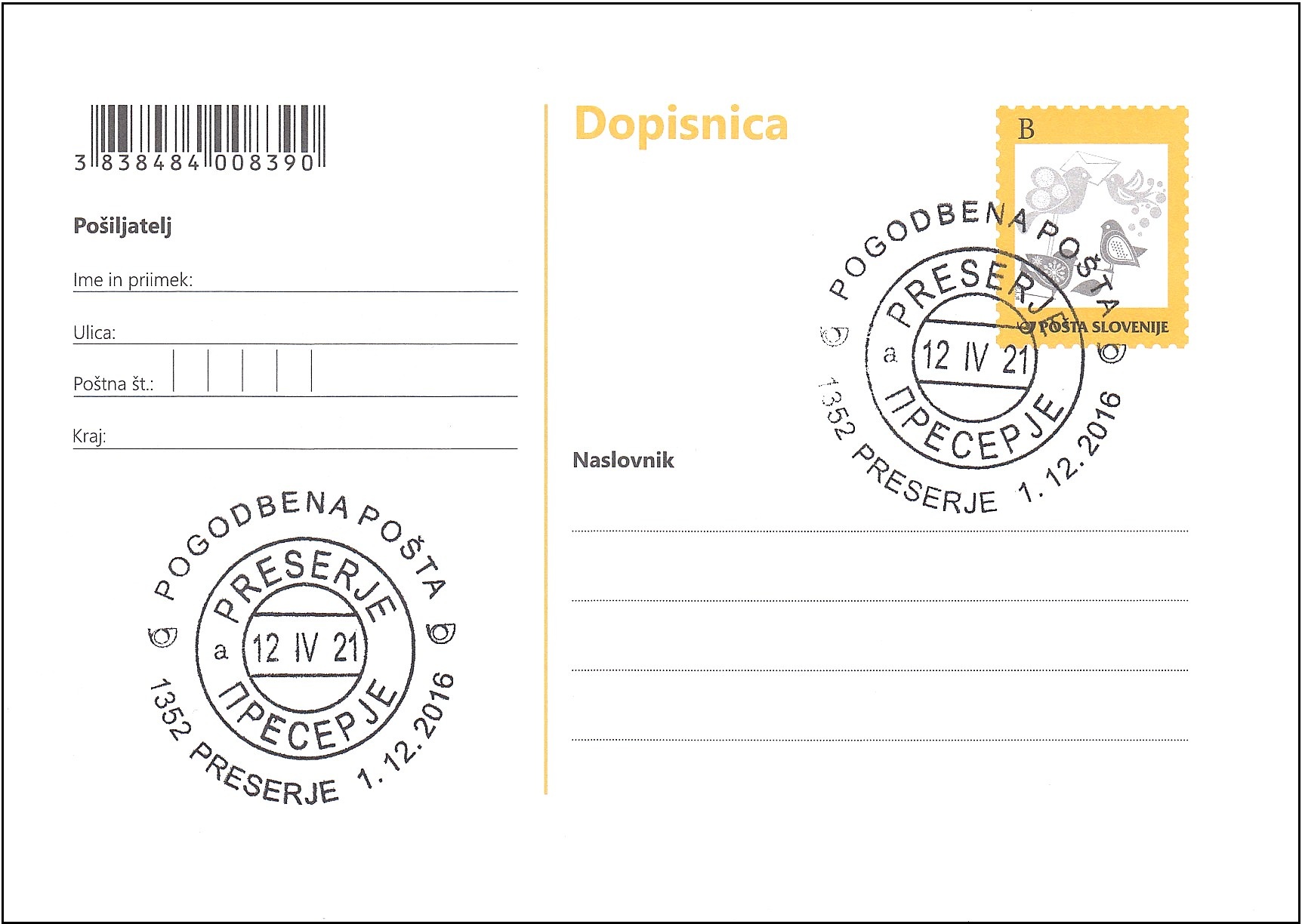 POGODBENA POŠTA 1352 PRESERJE