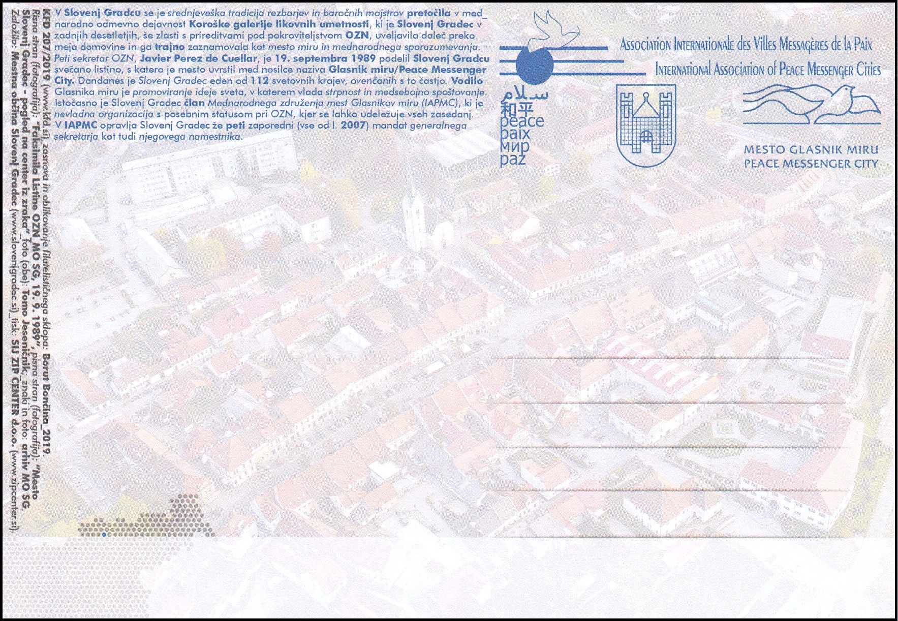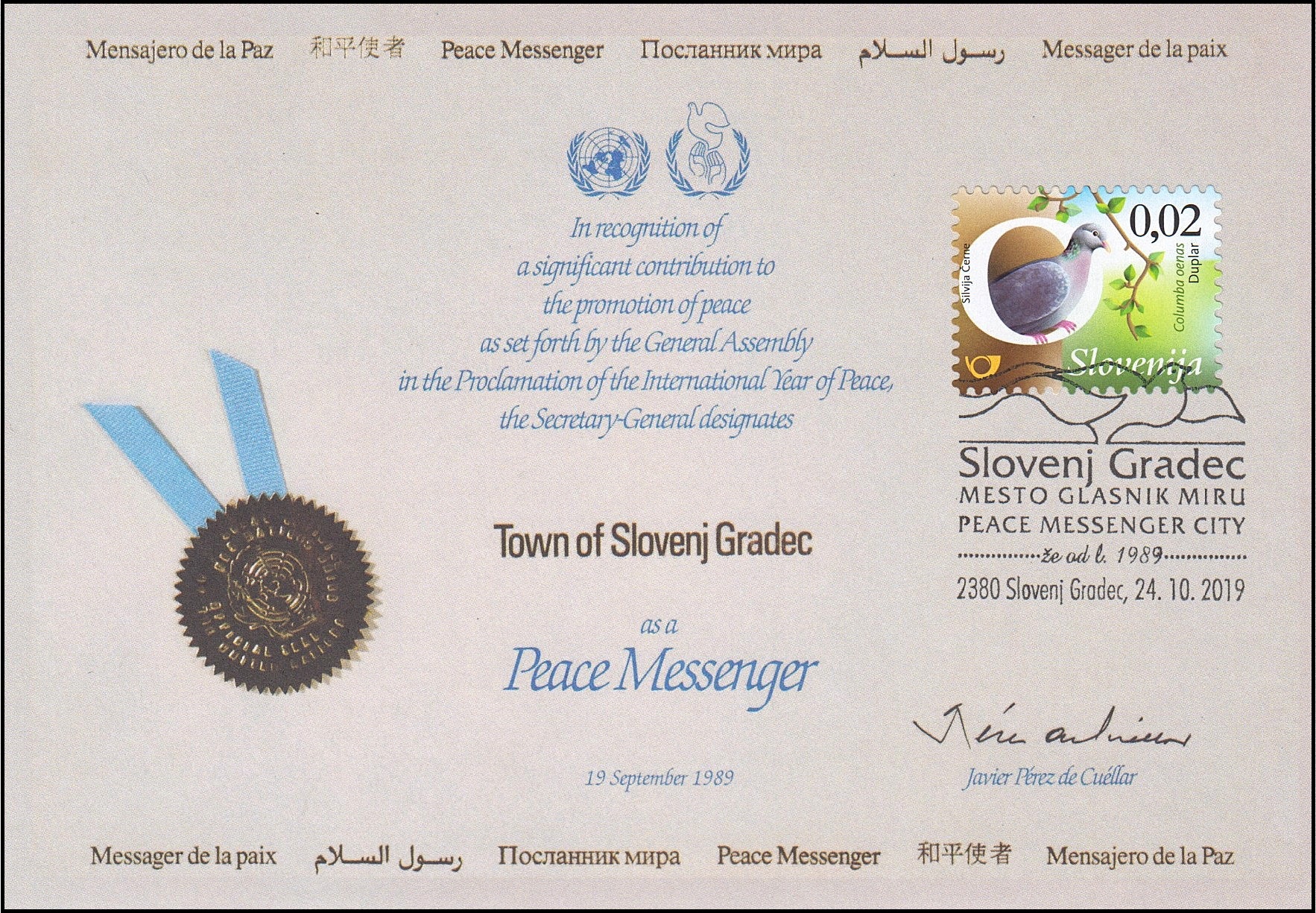 MESTO GLASNIK MIRU - SLOVENJ GRADEC - PEACE MESSENGEER CITY